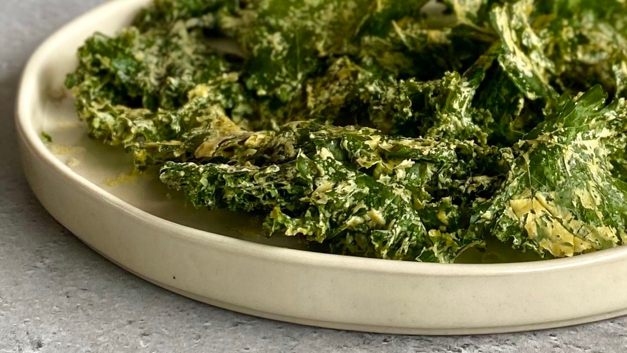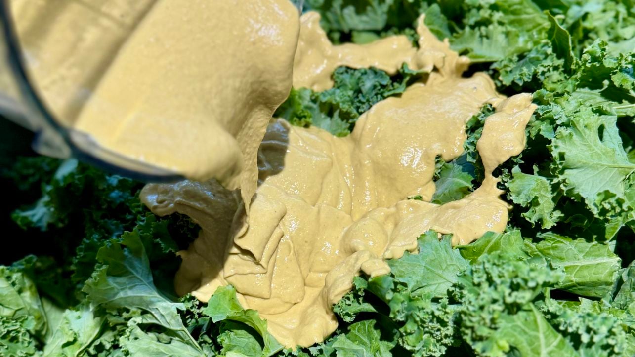 ローカシューナッツで仕込んだチージーソースを、フレッシュなケールにたっぷり絡めて。 ナッツのコクとケールの青みが、ここでしっかり重なります。 -