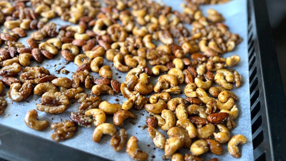 たまり醤油とメープルシロップをナッツに染み込ませ、ローフード製法で3日間乾燥させます。甘さと塩味が調和した、やみつきになる味わいに仕上げていきます。 -