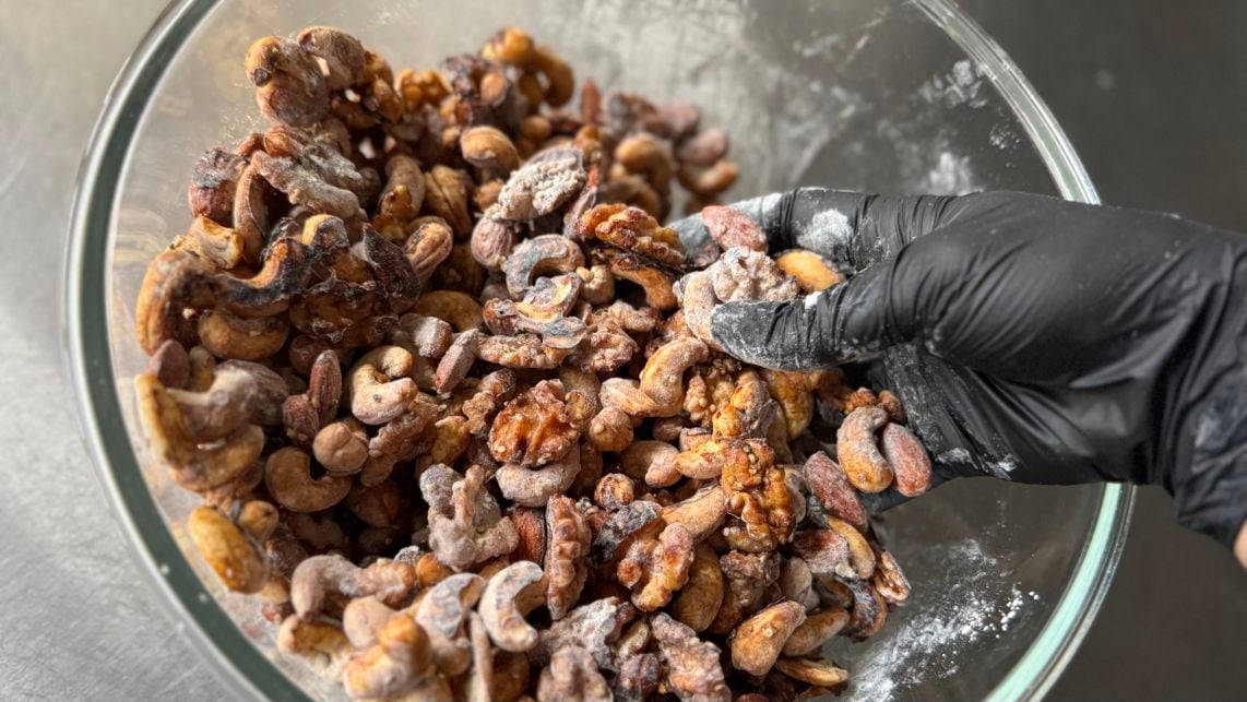 3日間乾燥させてできたナッツに、オニオンパウダーをたっぷりと絡ませていきます。オニオンの香りが食欲を刺激する仕上がりです。 -