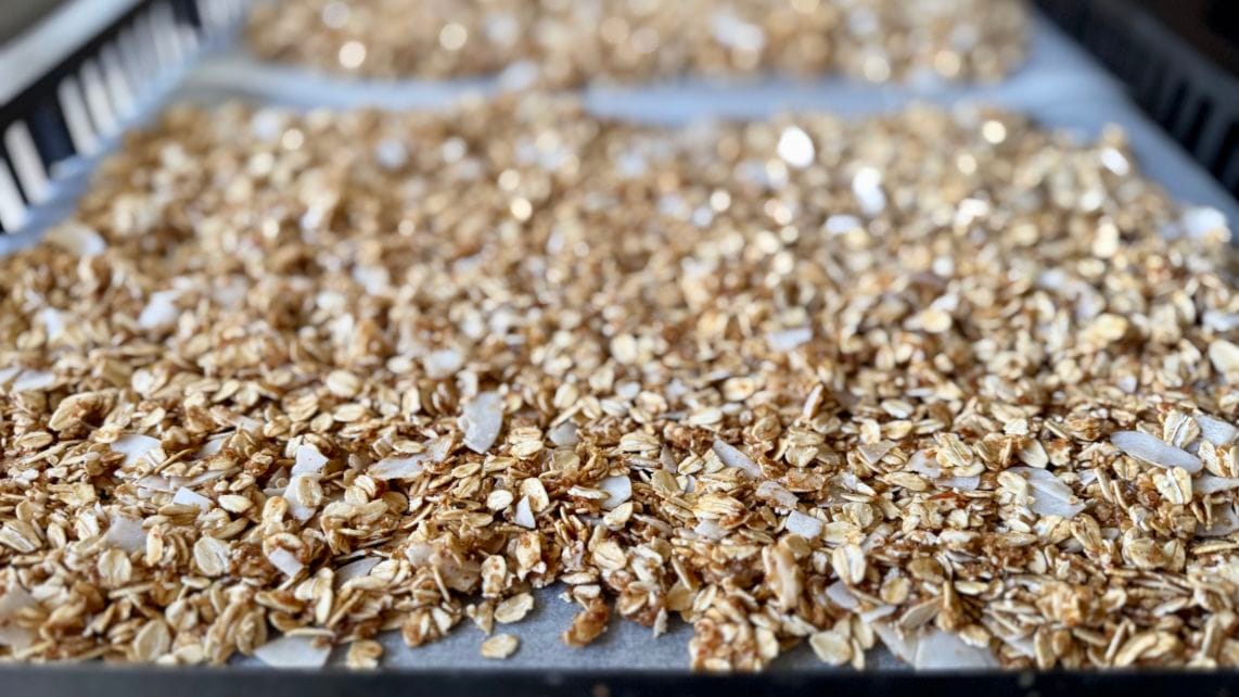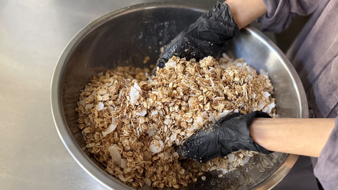 オートミールやココナッツ、アーモンドなどの素材を混ぜ合わせていきます。小麦や米粉等も不使用、ココナッツシュガーやメープルシロップなどの天然の甘味料を使用しています。天然の甘味料は白砂糖よりもミネラル豊富、腸やホルモンバランスにもやさしいです。 -