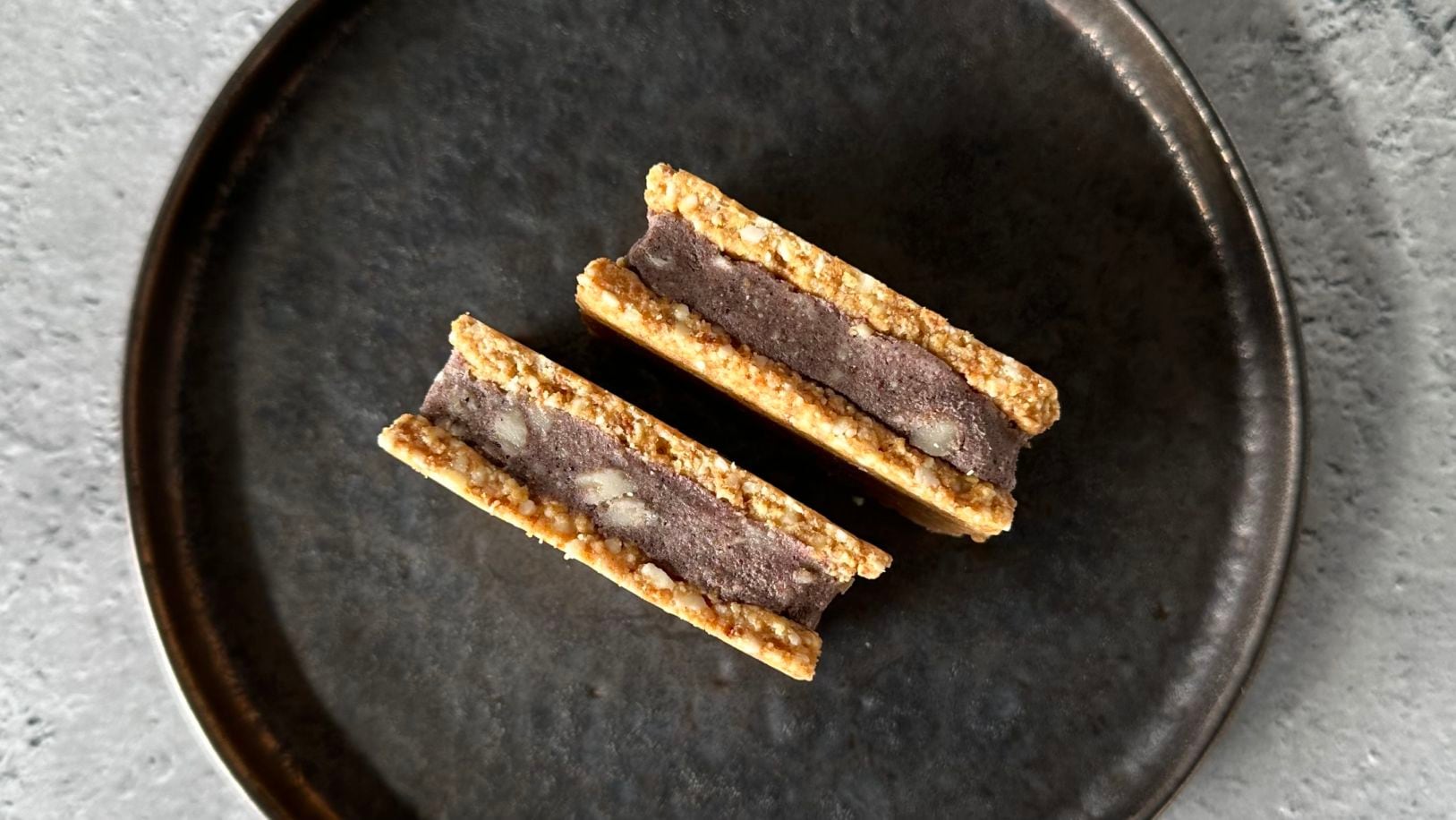 サンドしているロークッキーからひとつひとつハンドメイドで仕上げていきます。このロークッキーにもカシューナッツやアーモンドをふんだんに使用しています。 -