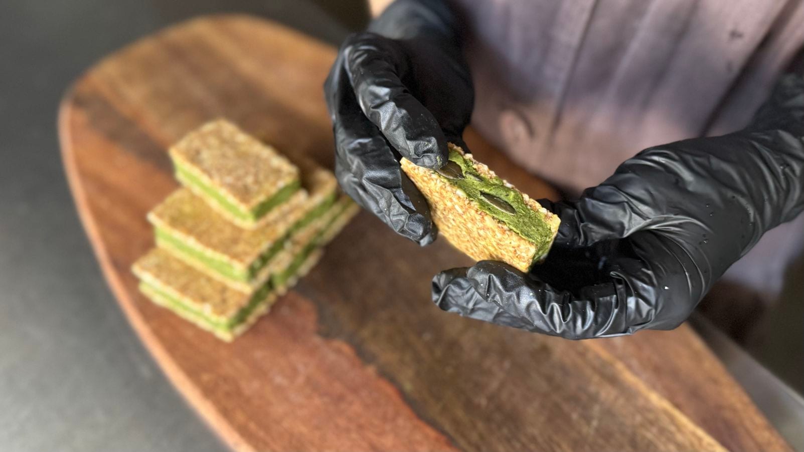 ナッツで作るクッキーにサンドしていきます。バターサンド抹茶は、1つあたりオーガニックナッツを26g使用し、ひとつでもしっかりと満足感を得られる仕上がりです。
