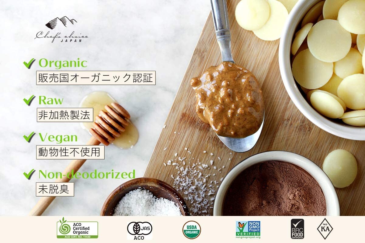 ローカカオバターは、ココアの豆から抽出される天然の脂肪で、ココアバターとも呼ばれます。食料品店でもよく見かけるものですが、オーガニックなうえにRAW製法で作られたローカカオバターは、より高品質であり、栄養価も高いとされています。農薬や化学肥料を一切使用せず、自然の力だけで育てられたクリオロ種豆から作られています。また、コールドプレスという低温加工法で製造されているため、栄養素や風味を損なわずにお楽しみいただけます。自然な風味と栄養が凝縮された、シェフズチョイスのオーガニックローカカオバターをお試しください。