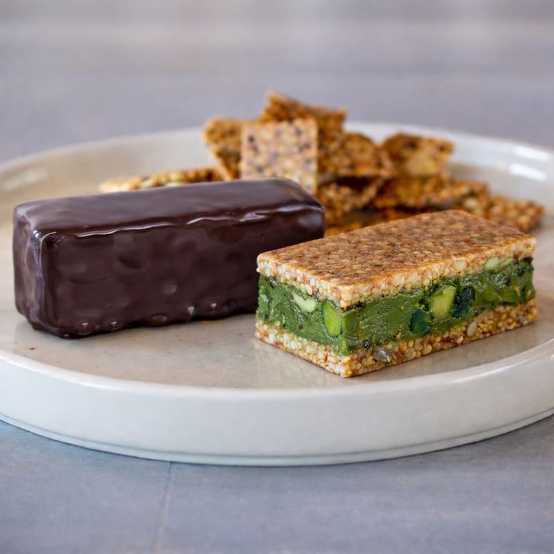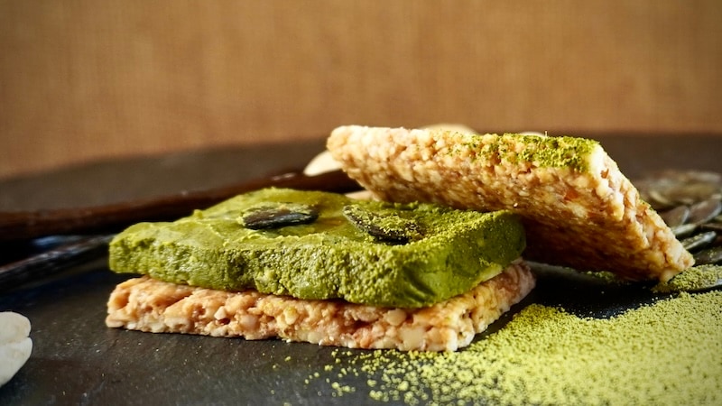 【抹茶:ローバターサンド】有機抹茶のほろ苦さと香りを楽しむローバターサンド。ローナッツのコクに、パンプキンシードの食感を添えて。 -