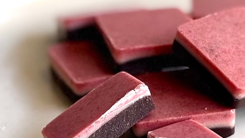 ザクロ、ストロベリー、ビーツのピンク層と、マカ&ルクマのハイカカオ層。